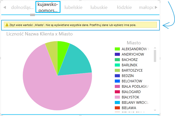 W przypadku synchronizacji kolorów dla jednej danej jakościowej (np. miejscowości) przypisany jest tylko jeden kolor. Może mieć to znaczenie we wszystkich wizualizacjach, także w wykresie kołowym oraz mapie. Należy jednak przy korzystaniu z tej funkcji zachować ostrożność – liczność kolorów jest ograniczona i może się okazać, iż mamy zbyt wiele danych jakościowych aby każdej wartości przypisać oddzielny kolor. O takiej sytuacji zostaniemy poinformowani stosownym komunikatem: