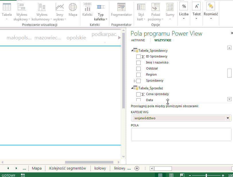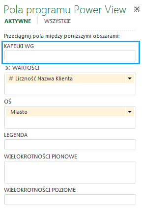 Podczas tworzenia lub edycji jakiegokolwiek wykresu, na liście pól programu PowerView możemy dostrzec obszar KAFELKI WG. Kafelki w tym kontekście nie wyznaczają płytek służących do wykończenia kuchni, lecz są narzędziem pozwalającym na sprawne przefiltrowywanie danych, nie psując przy tym kompozycji wizualnej raportu.