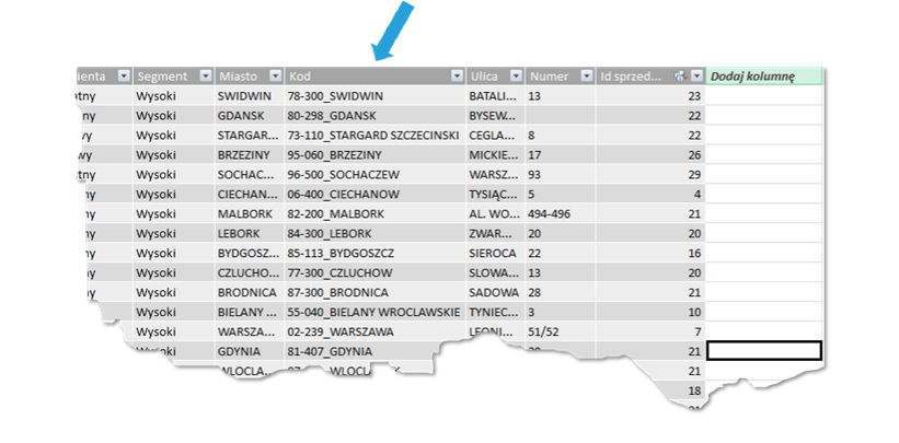 Można też dodać kolumnę w oparciu o funkcję DAX. W tym celu otwórzmy w PowerPivot interesującą nas tabelę (w przypadku przykładowego pliku będzie to tabela Klienci). Naszym celem będzie stworzyć kolumnę, która będzie zawierała sam kod pocztowy, a nie, tak jak kolumna Kod, kod pocztowy, znak „_” oraz nazwę miejscowości.