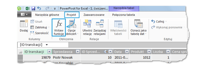 W ten sposób zaznaczymy całą nową kolumnę. Teraz tworzymy formułę DAX – podobnie jak w skoroszytach Excela, możemy zrobić to na dwa sposoby. Pierwszym jest kliknięcie Projekt -> Wstaw funkcję: