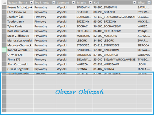 Kolumny oraz pola obliczeniowe służą do pozyskania dodatkowych danych. W przypadku kolumny obliczamy indywidualną wartość dla każdego wiersza. W przypadku pól obliczeniowych sprawa ma się nieco inaczej – tam operacje wykonuje się na całych kolumnach bądź tabelach. Klasycznymi przykładami pól obliczeniowych są sumy czy też średnie.