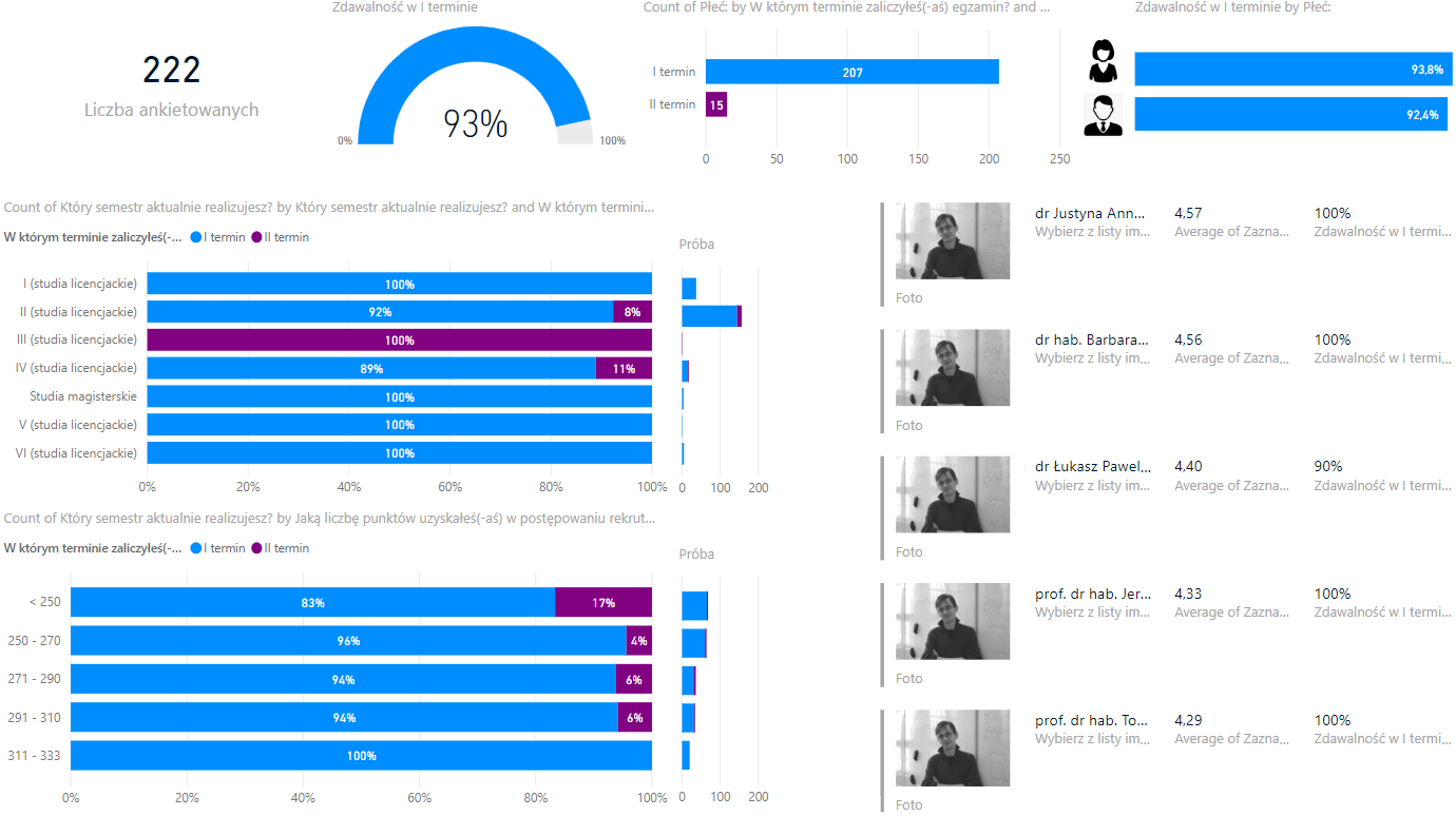 Przykładowy raport (tu możesz pobrać plik Power BI) utworzony na koniec był projektowany z myślą o braku interakcji, które daje Power BI (o nich powiemy sobie szerzej na jednym z kolejnych meetupów). Dane pochodzą z badania ankietowego studentów przeprowadzonego przez SKN Statystyki SGH na studentach, którzy uczestniczyli w zajęciach z matematyki. Końcowy raport jest analizą zdawalności tego przedmiotu i poszukiwaniem grup, które ze zdaniem „matmy” miały problemy.
