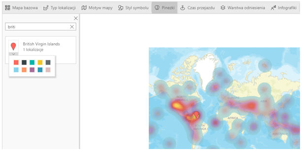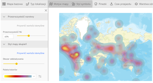 Działają w zależności od tego jaki motyw mapy zostanie wybrany, wówczas dostępne są tu różne opcje edycji wybranego motywu np. skale kolorów, przezroczystość, kształt, rozmiar symbolu itd.