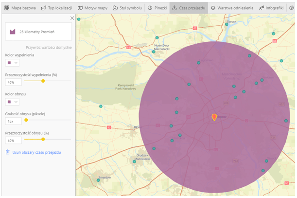 Ważną funkcją jest tu możliwość zaznaczenia strefy dojazdu poprzez wybór odpowiedniego zaznaczenia. Dzięki temu wiemy, ile punktów znajduje się w środku strefy.