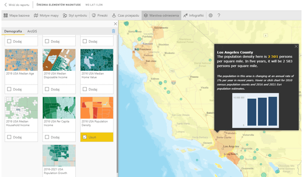 To świetna funkcja, która do wizualizacji dodaje również kontekstualną (zmieniającą się od zaznaczonych/widocznych danych) informację, z bardzo szerokiego zakresu (np. populacji, wieku czy dochodu). Niestety dane w infografice (ze względu na podstawowe usługi ArcGIS) dotyczą jedynie Stanów Zjednoczonych.