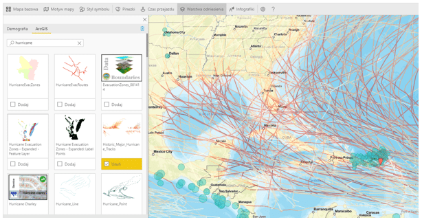 Na poniższym przykładzie wśród dostępnych map wyszukałem mapy dotyczące huraganów. W ten sposób powstała ciekawa mapa Ameryki Środkowej z nałożeniem na siebie miejsc wstępowania huraganów oraz trzęsień ziemi (w postaci linii).