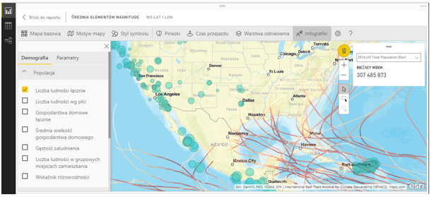 ArcGIS Maps for Power BI oferuje różne warstwy danych demograficznych, które pozwalają na zaprezentowanie danych ze źródła na tle danych demograficznych dot. ludności danego obszaru. W części Demografia do wyboru jest kilka warstw, poprzez zaznaczenie pola wyboru przy niej, zostanie wykorzystana na mapie.