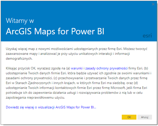 Komponent ArcGIS for Power BI dostarczany jest przez firmę Esri, w związku z czym korzystanie z tego komponentu objęte jest dodatkowymi warunkami, na które użytkownicy Power BI muszą wyrazić zgodę (w oknie dialogowym).