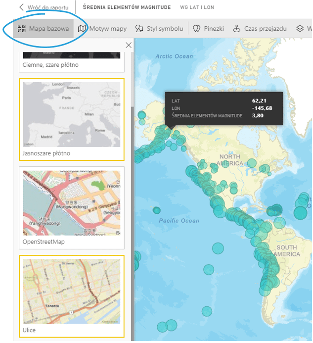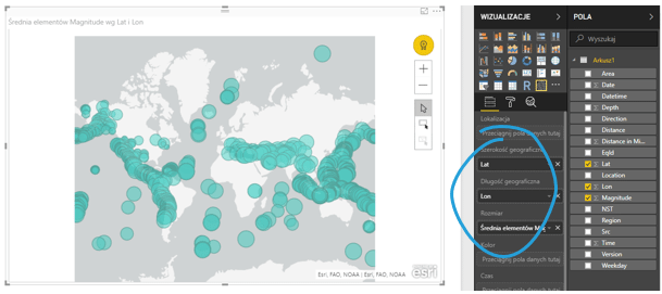 Z dostępnych wizualizacji wybieram ArcGIS Map, Szerokości geograficznej umieszczam pole Lat, w Długości geograficznej pole Lon, zaś jako rozmiar Magnitude (średnia). Dzięki temu otrzymuję mapę z punktami wystąpień trzęsień ziemi i ich średnią siłą w danym punkcie.