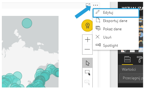 Punkty mają bardzo zbliżone wielkości, a mapa sama w sobie jest mało interesująca, dlatego warto przyjrzeć się dodatkowym opcjom. Kryją się one w prawym górnym rogu wizualizacji, pod przyciskiem wielokropka > Edytuj.