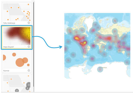 • Rozmiar nakreślenie punktów na mapie, których wielkość odpowiada wartości w zasobniku rozmiaru