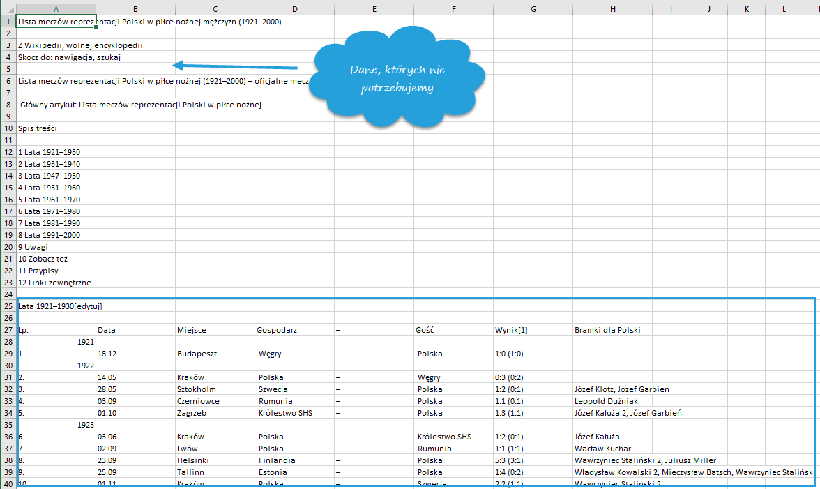 Obróbka tych danych, zwłaszcza dodanie kolumny data meczu w formacie YYYY-MM-RR dla każdego wpisu byłoby drogą przez mękę. Co więcej dane na Wikipedii były rozrzucone na dwóch stronach, co oznacza, że cały proces przygotowania danych musiałbym powtórzyć ręcznie dla drugiej strony.