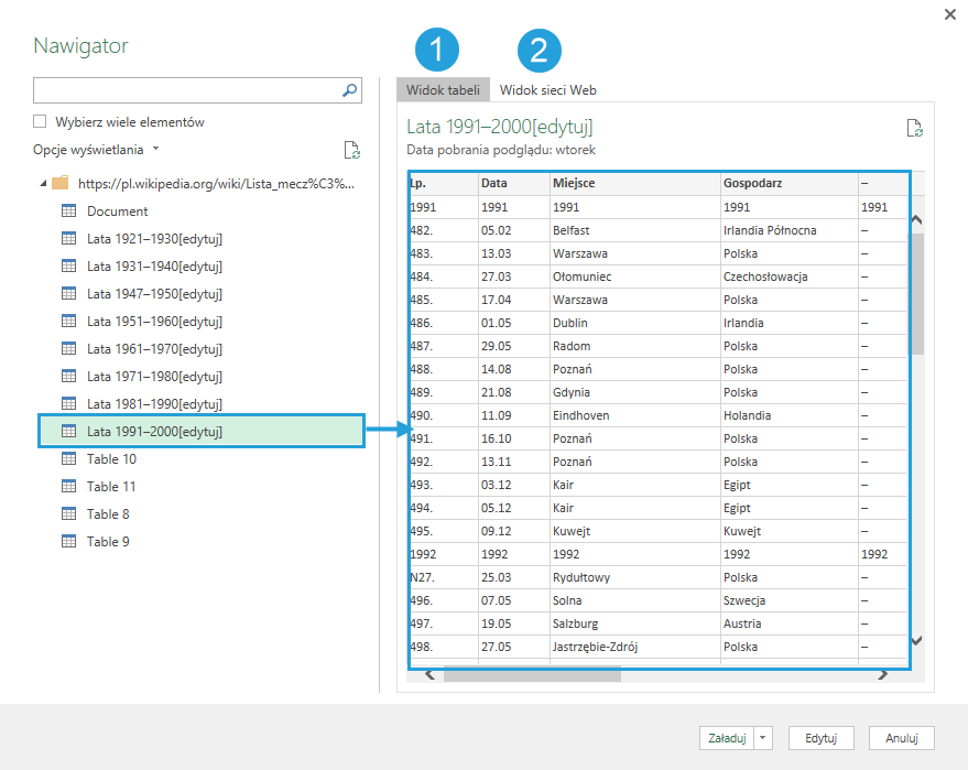 Z jednej strony Power Query potrafi wczytać strukturę html strony (element Document), z drugiej zaś świetnie wychwytuje pojedyncze tabele. Do dyspozycji mamy 2 widoki podglądu: