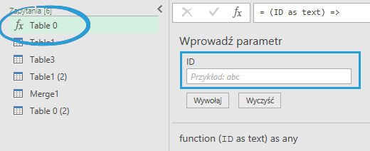 Upewniwszy się, że kolumna ma format tekstowy, możemy utworzyć nową kolumnę, która będzie pochodzić z wywołania naszej funkcji. Na karcie Dodaj kolumnę wybieramy Wywołaj funkcję niestandardową, a następnie wybieramy funkcję (moja nazywała się Table 0) oraz wskazujemy kolumnę, w której mamy argumenty.