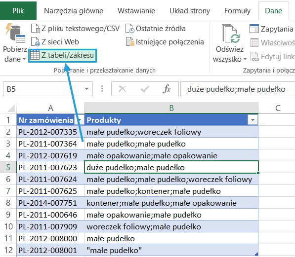 - Excel 2016 i 365 – karta Dane > Z tabeli/zakresu