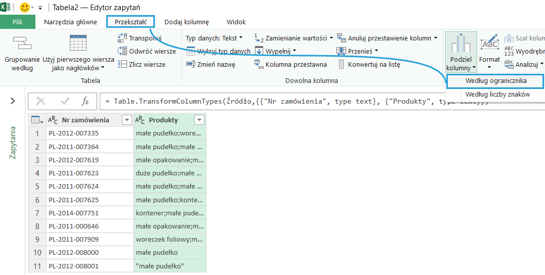 Następnie zaznaczamy kolumnę do rozdzielenia > karta Przekształć > Podziel kolumny > Wg ogranicznika.