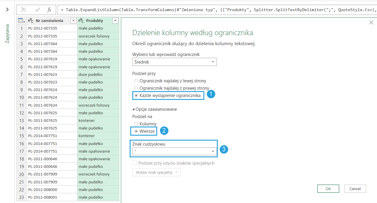 W otwartym oknie wybieramy ogranicznik (np. średnik), a następnie: