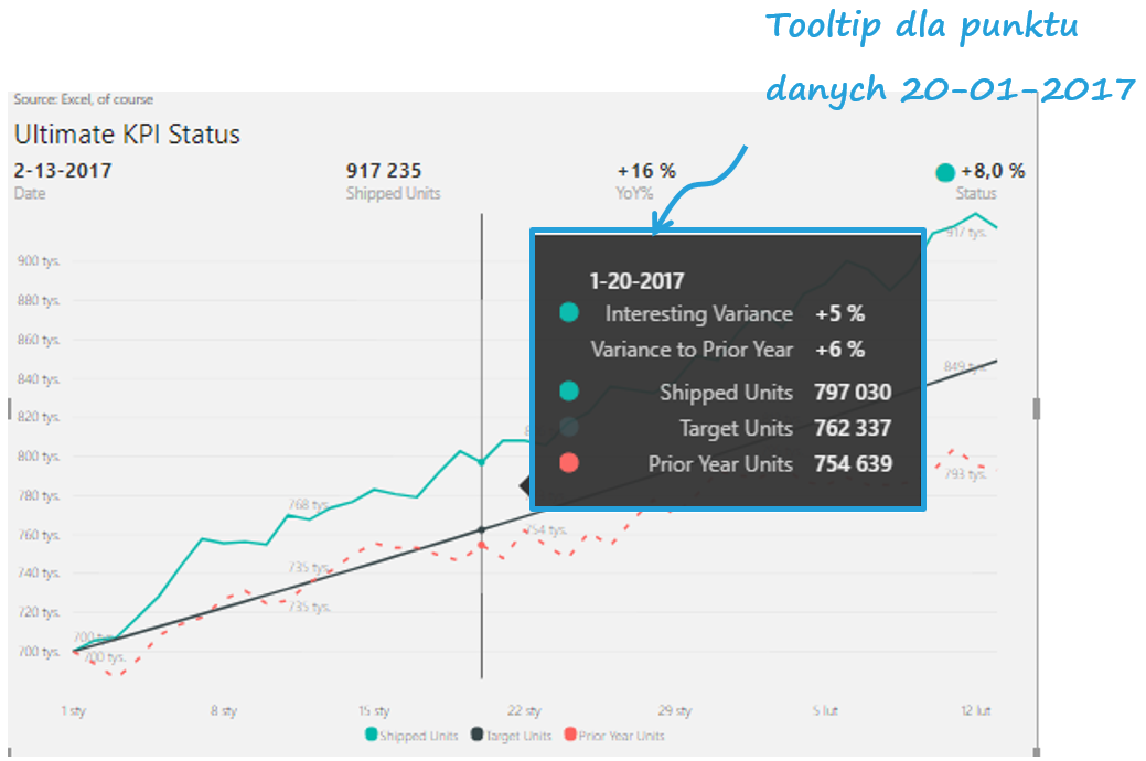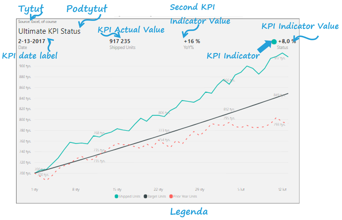 Power KPI pozwala na konstrukcję wieloliniowych wykresów z szerokim wachlarzem opcji, które mogą być konfigurowane w różny sposób. Prezentuje tytuł oraz podtytuł prezentacji, ostatnią datę oraz poziom KPI (wraz z wartością, odchyleniem oraz przypisanym do niego symbolem).