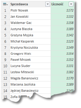 #”Pogrupowano wiersze” = Table.Group(Źródło,{„Sprzedawca”, „Producent”}, {{„Liczność”, each Table.RowCount(_), type number}, {„srednia”, each List.Average([Cena]), type number}})