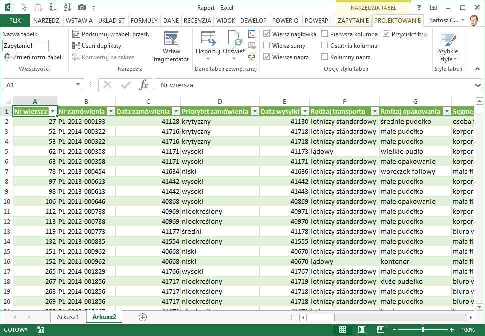 Opcja Zamknij i załaduj w zakładce Narzędzia główne ładuje dane do nowego arkusza Excel w formacie tabeli.