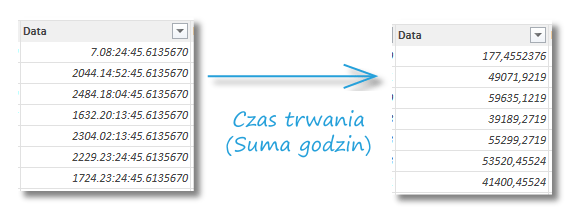 W przypadku wybrania jednej z ostatnich opcji (Suma dni, Suma godzin, Suma minut, Suma sekund) przedstawimy czas trwania w wybranej przez nas jednostce czasu. Przykładowo, jeżeli wybierzemy godziny, to liczba dni zostanie zamieniona na odpowiednią liczbę godzin, a minuty i sekundy zostaną przedstawione jako część ułamkowa.