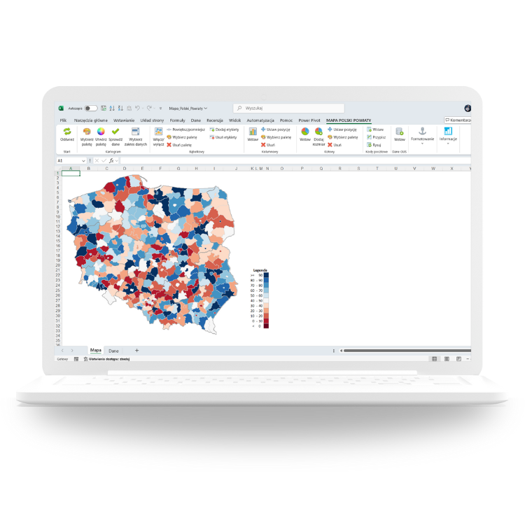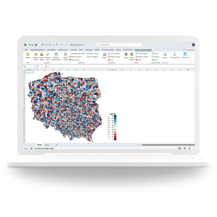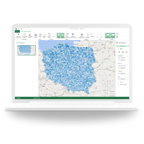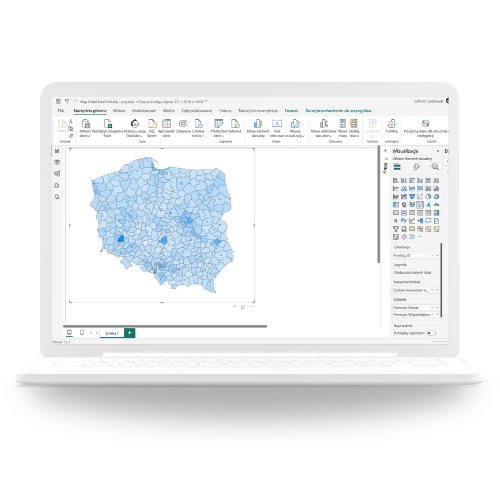 Mapa jest łatwa w obsłudze, a utworzenie pierwszej mapy zajmie Ci kilka minut. Mapa wykorzystuje standardowe elementy programu Excel – arkusze, wykresy, formatowanie.