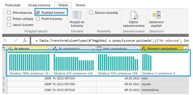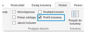 Wchodząc do Edytora kwerend w kartę Widok ,w sekcji Podgląd danych znajduję trzy opcje: Rozkład kolumn, Profil kolumny, Jakość kolumn.