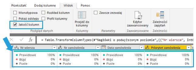 Pokazuje jak rozkładają się procentowo wartości w poszczególnych kolumnach , w kategoriach prawidłowe, błąd oraz puste. Jakość danych w kolumnie prezentowana jest również na pasku, pojawiającym się zaraz pod nazwą kolumny.