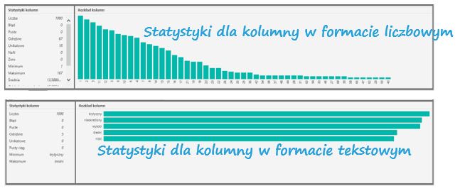 – Statystyki kolumn – dostępne po lewej stronie okna, w zależności od typu danych (tekstowe, liczbowe, data) w kolumnie mogą się pojawić inne miary. Znajdę tu m.in. liczba elementów, liczba błędów, pustych, minimum, maksimum, średnia, mediana, odchylenie standardowe