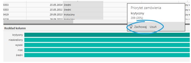 – Rozkład kolumn – widoczne po prawej stronie okna, jest to powiększona wersja histogramu widocznego przy włączonej opcji Rozkład kolumn (omawianej wyżej w artykule). Posiada dodatkową funkcjonalność, wybierając jedną z kolumn histogramu , pojawia się okno z opcją Zachowaj/ Usuń . Jest to możliwość modyfikowania filtrów na danej kolumnie: