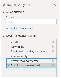 Krok filtrowania pojawia się również po prawej stronie wśród Zastosowanych kroków analizowanego zapytania.