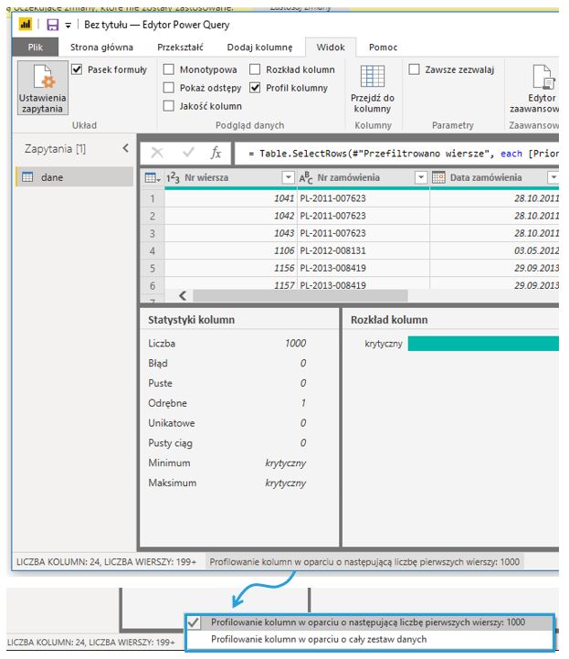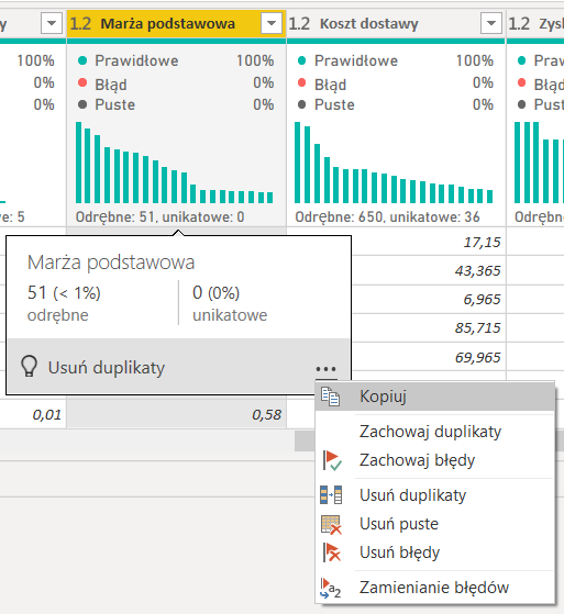 Power Query pozwala umożliwia też wykonanie od razu na widoku profilu kolumny podstawowe operacje, takie jak: