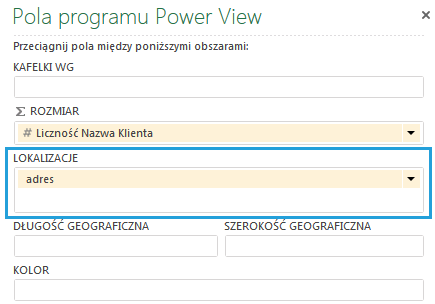 Aby skorzystać z pozycjonowania względem adresu musimy posiadać wszelkie informacje – a więc miasto, ulicę oraz numer budynku – w jednej kolumnie. Umieszczamy ją w obszarze Lokalizacja: