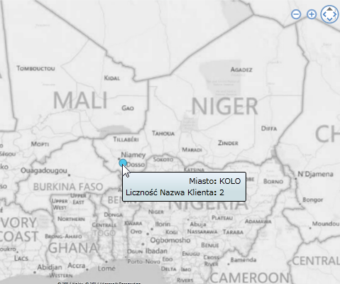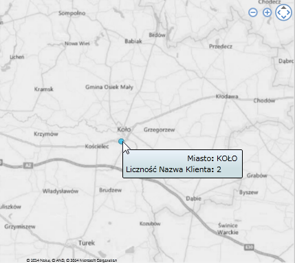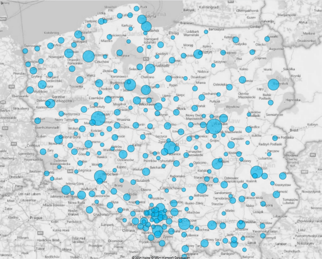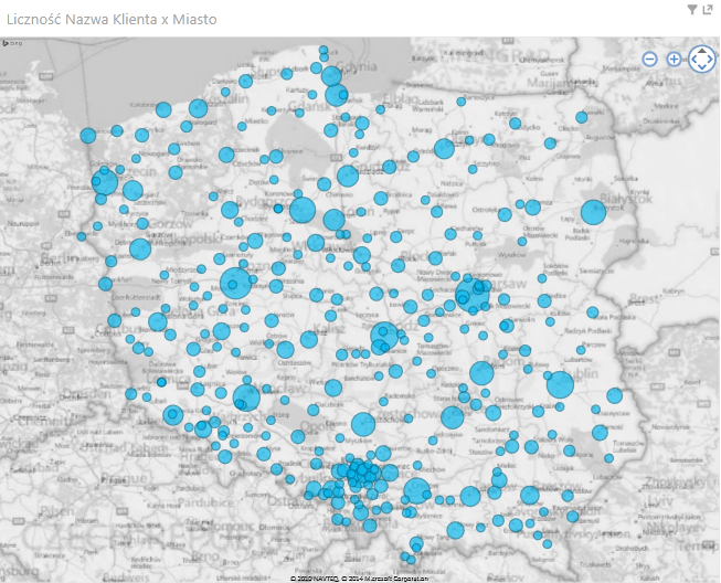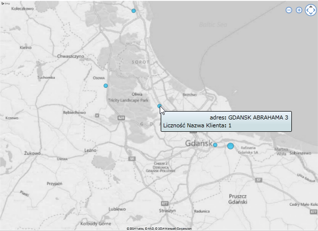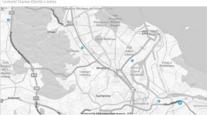 Niestety podczas dalszej analizy mapy ujawniają się też jej wady – z niewiadomych powodów mapy Bing nie potrafią zlokalizować niektórych adresów. Wykorzystajmy Gdańsk do pokazania tego zjawiska – na terenie miasta jest zlokalizowanych pięć bąbelków przedstawiających sześciu klientów: