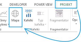 Abyśmy mogli przedstawić jakąś wartość na mapie, musi ona mieć zdefiniowane położenie w przestrzeni geograficznej. W PowerView możemy określić położenie na kilka sposobów – poprzez nazwę własną (np. miasta, województwa, kraje), dokładny adres oraz współrzędne. Więcej na ten temat w dalszej części tego tekstu. Załóżmy, iż naszym celem jest przedstawienie liczby klientów w poszczególnych miastach. W pierwszej kolejności tworzymy tabelę z interesującymi nas danymi, a następnie, mając ją zaznaczoną, klikamy PROJEKT -> Mapa: