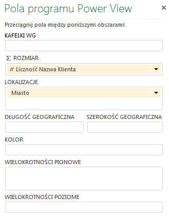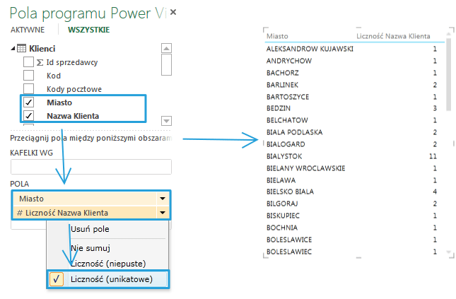 W celu utrwalenia wiadomości na temat map w PowerView można wykonać poniższe ćwiczenia praktyczne. Dane na których opracowane są poniższe przykłady można znaleźć w pliku Excela znajdującym się pod tekstem. W pierwszej kolejności tworzymy w PowerView tabelę, w której będą dane odnoszące się do przestrzeni geograficznej. Z listy pól programu PowerView rozwijamy tabelę „Klienci” i wybieramy obiekty miasta oraz Nazwa klienta. Klikamy na trójkącik koło napisu Nazwa klienta i zmieniamy wartość z Nie sumuj na Liczność (unikatowe). Dzięki temu w tabeli nie będą wyświetlane nazwiska klientów, lecz ich liczba w poszczególnych miastach.