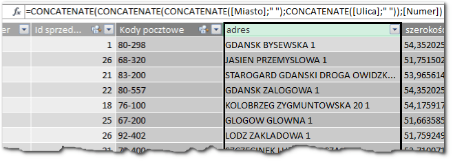 Do stworzenia naszej wizualizacji wykorzystaliśmy tylko kolumnę Miasto, w tabeli w PowerPivot mamy jednak dużo więcej danych – ulicę oraz numer domu/mieszkania. Możemy je wykorzystać do dokładniejszego zlokalizowania bąbelków na mapie. W tym celu musimy najpierw w PowerPivot w tabeli Klienci przygotować kolumnę z przyjaznym dla programu formatem adresu, który wygląda w następujący sposób: