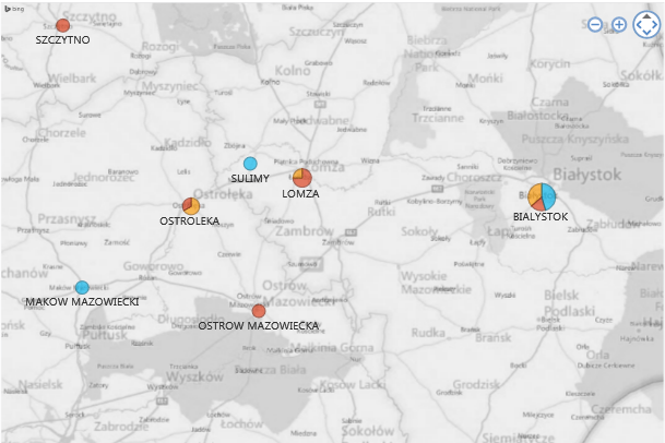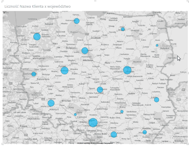 Operacja ta pozwoli na przełączanie się między widokiem pokazującym liczbę klientów w miastach danego województwa a widokiem pokazującym dokładną lokalizację klientów w danym mieście: