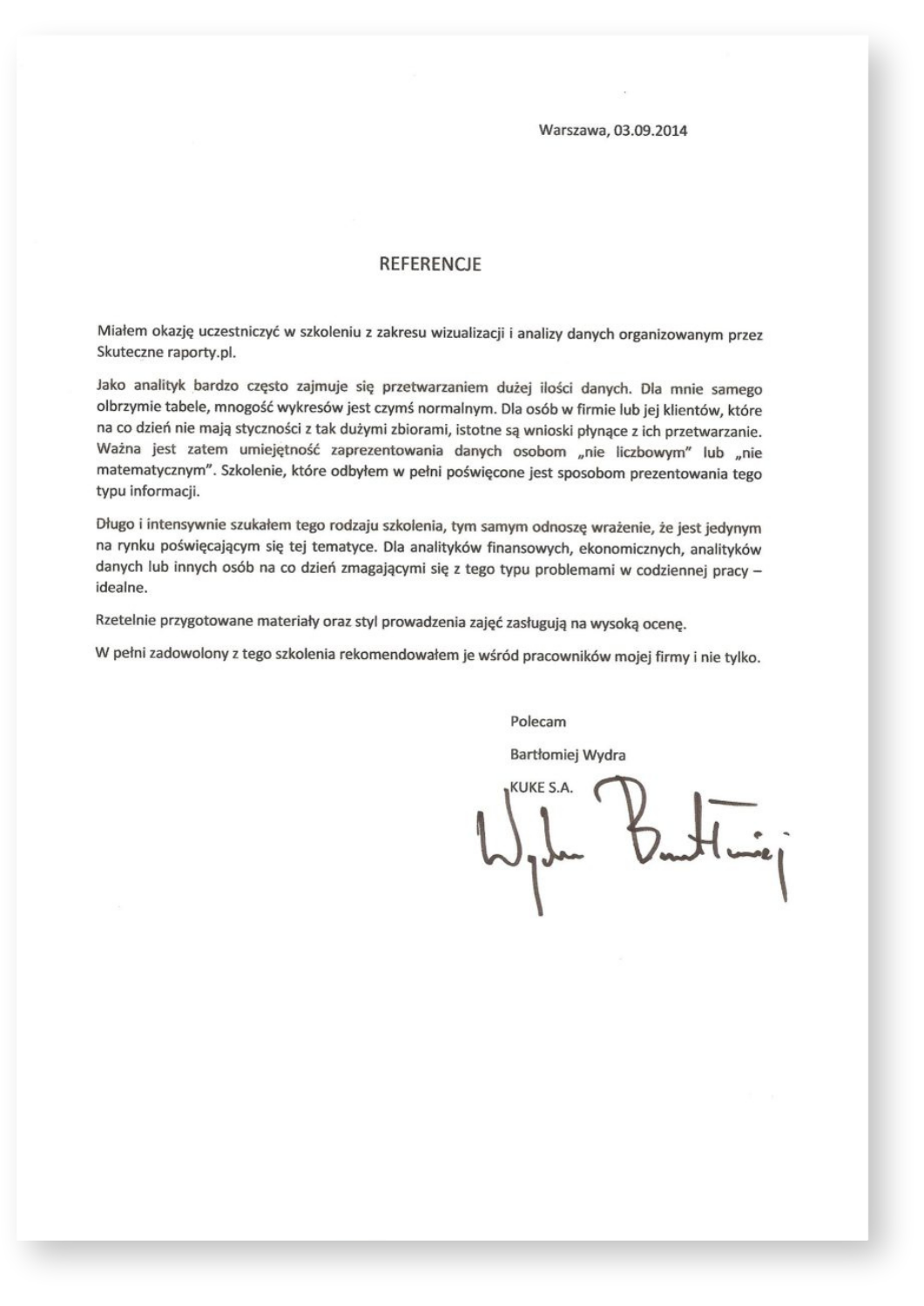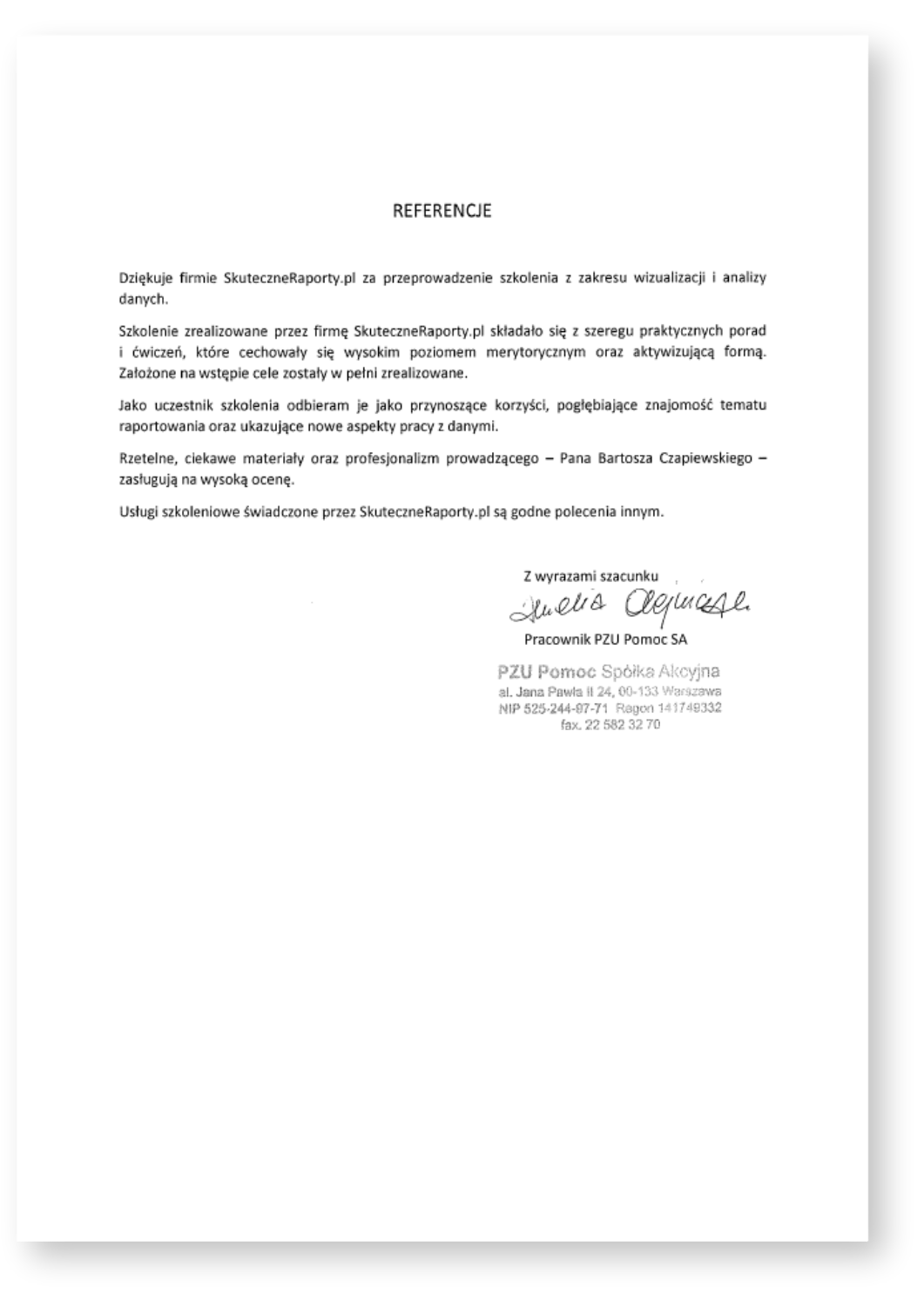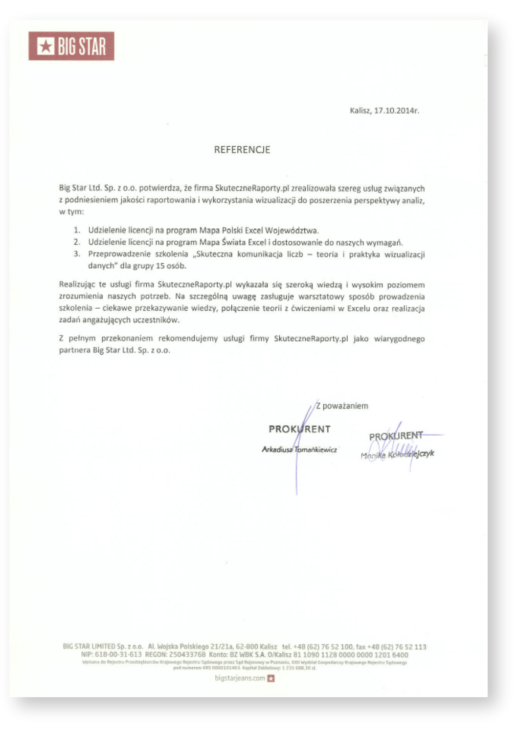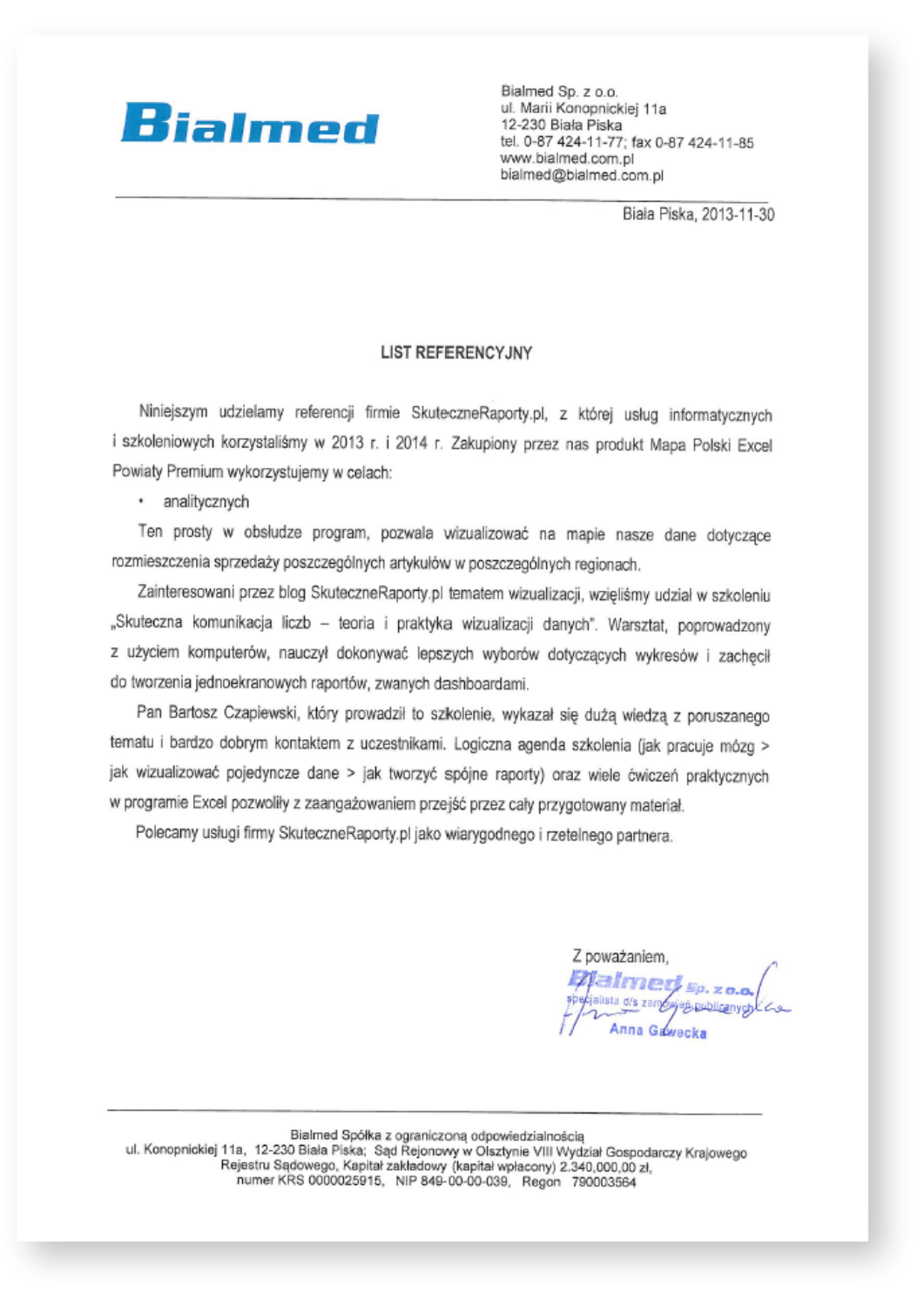 Niniejszym udzielamy referencji firmie SkuteczneRaporty.pl, z której usług informatycznych i szkoleniowych korzystaliśmy w 2013 i 2014 r. Zakupiony przez nas program Mapa Polski Excel Powiaty Premium wykorzystujemy w celach analitycznych – pozwala wizualizować na mapie dane dotyczące rozmieszczenia sprzedaży poszczególnych artykułów w regionach. Zainteresowani przez blog SkuteczneRaporty.pl, wzięliśmy udział w szkoleniu „Skuteczna komunikacja liczb – teoria i praktyka wizualizacji danych”. Polecamy usługi firmy SkuteczneRaporty.pl jako wiarygodnego i rzetelnego partnera.