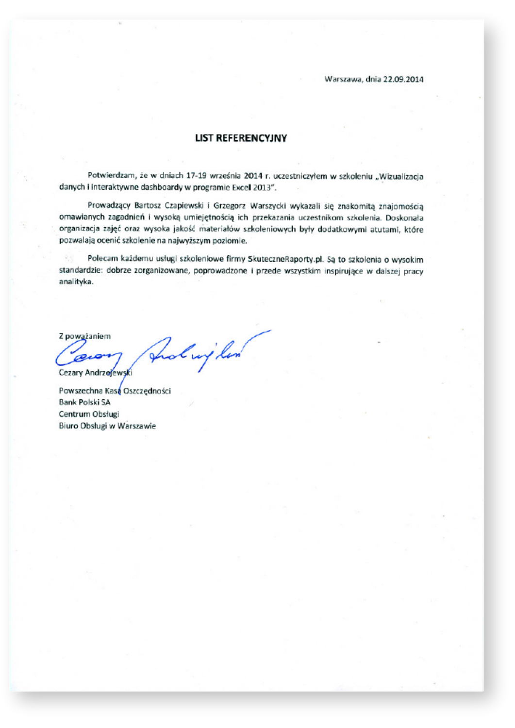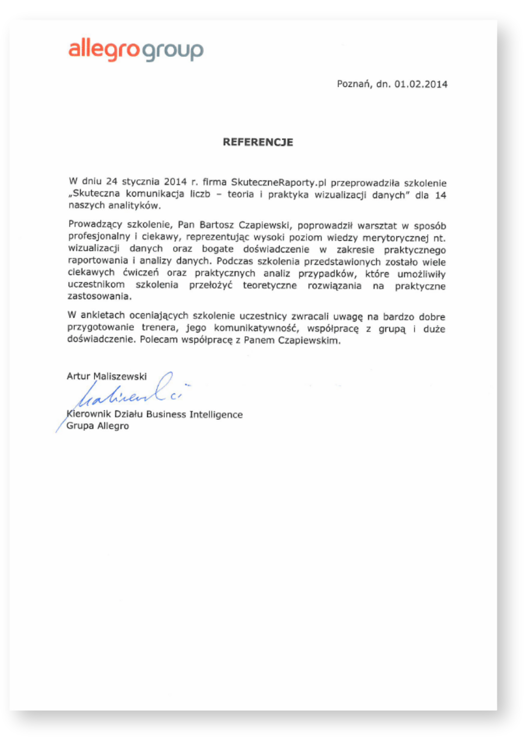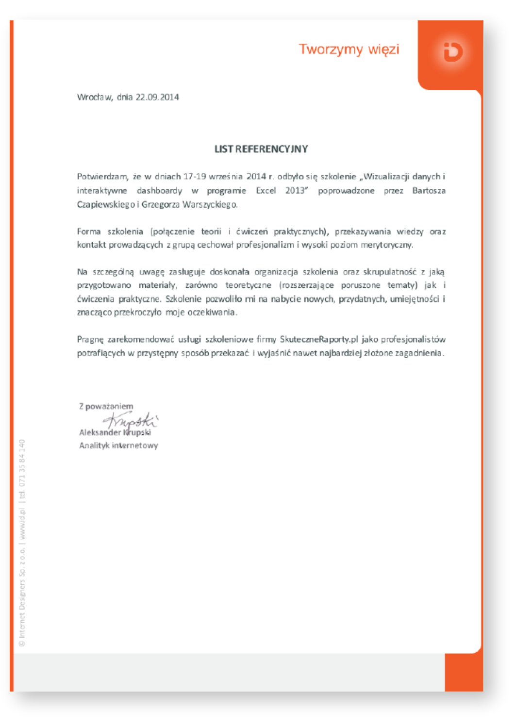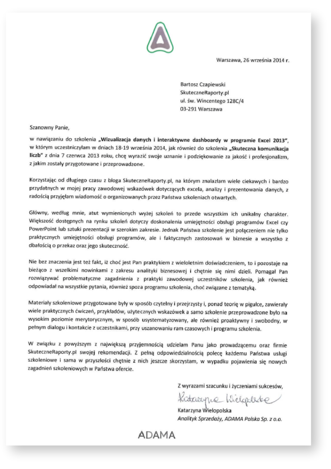 Niniejszym udzielamy referencji firmie SkuteczneRaporty.pl, z której usług informatycznych i szkoleniowych korzystaliśmy w 2013 i 2014 r. Zakupiony przez nas program Mapa Polski Excel Powiaty Premium wykorzystujemy w celach analitycznych – pozwala wizualizować na mapie dane dotyczące rozmieszczenia sprzedaży poszczególnych artykułów w regionach. Zainteresowani przez blog SkuteczneRaporty.pl, wzięliśmy udział w szkoleniu „Skuteczna komunikacja liczb – teoria i praktyka wizualizacji danych”. Polecamy usługi firmy SkuteczneRaporty.pl jako wiarygodnego i rzetelnego partnera.