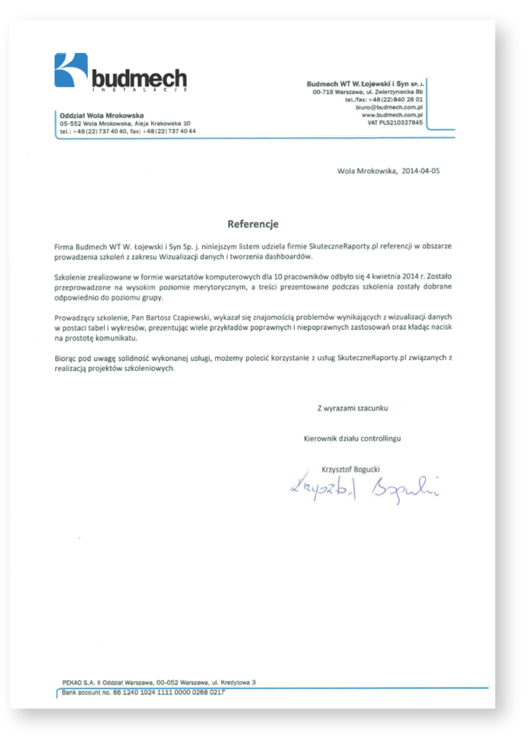 Krzysztof Bogucki Kierownik Działu Controllingu, Budmech WT sp. j.