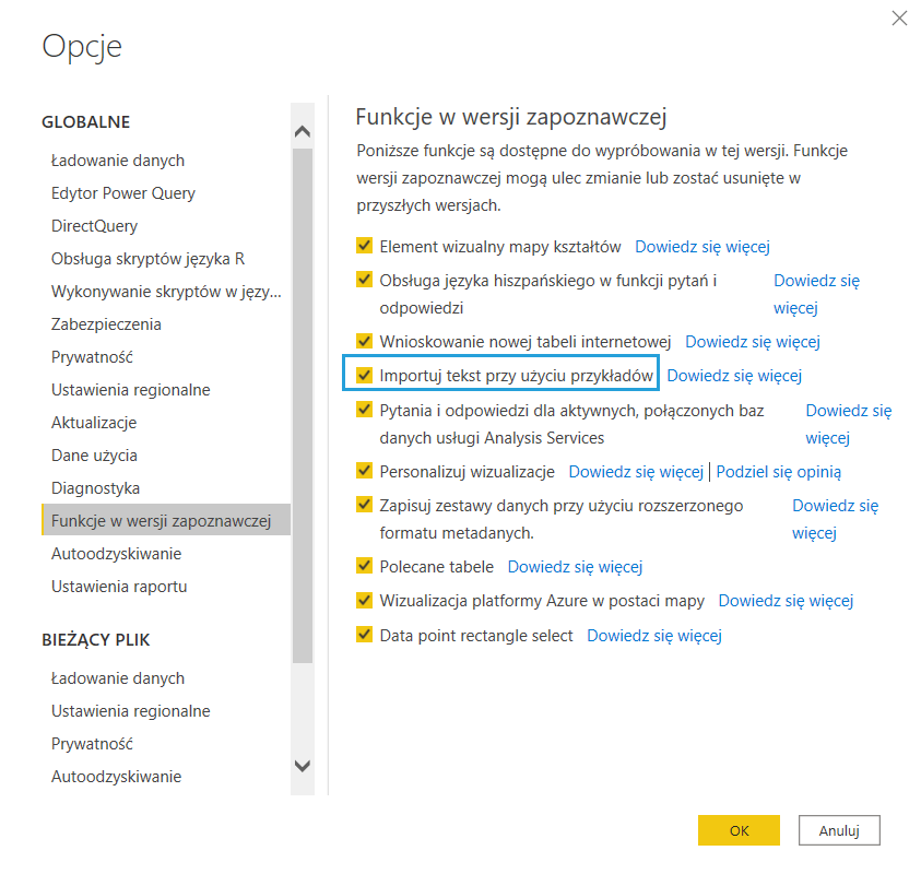 Spróbujemy przetestować działanie nowej funkcji. Tradycyjnie włączyć ją należy w opcjach preview w Power BI, przynajmniej w momencie publikacji artykułu.