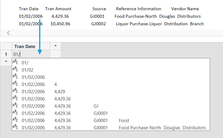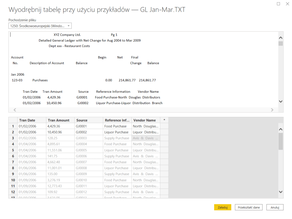 W kolejnym kroku, podobnie jak przy Kolumnie z przykładów, wpisujemy przykładowe wartości na bazie naszego pliku. Dane cały czas widzimy w tabeli a Power Query podpowiada całe ciągi tekstowe.