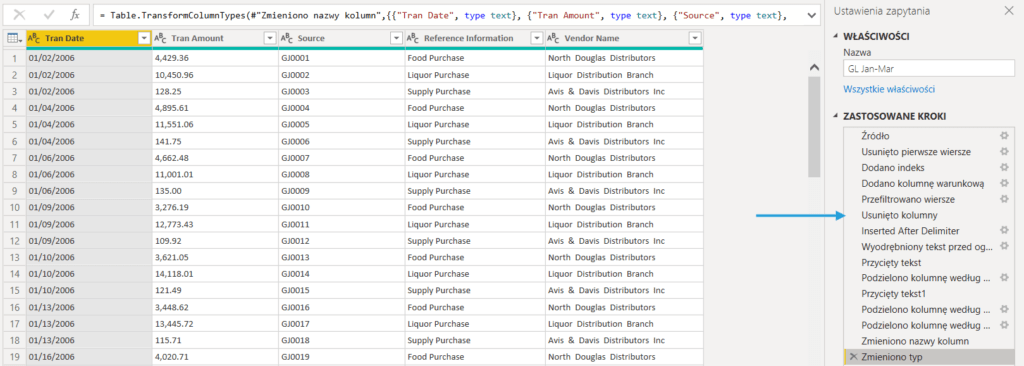Możemy teraz przejrzeć kroki i usunąć niepotrzebne lub błędne. Przykładowo w moim pliku Power Query próbowało łączyć nagłówki w jeden wiersz z danymi, ale usunięcie lub modyfikacja kilku kroków przywróciła wszystkie wiersze i po chwili tabela była gotowa do raportu.