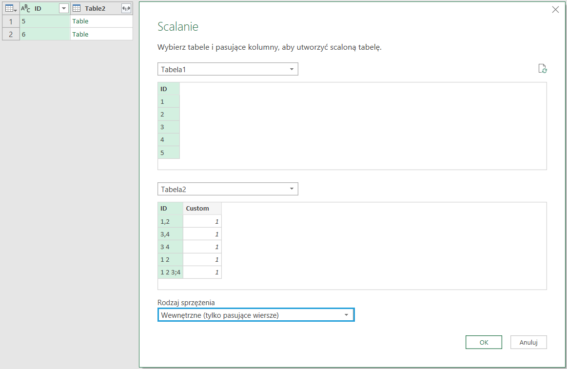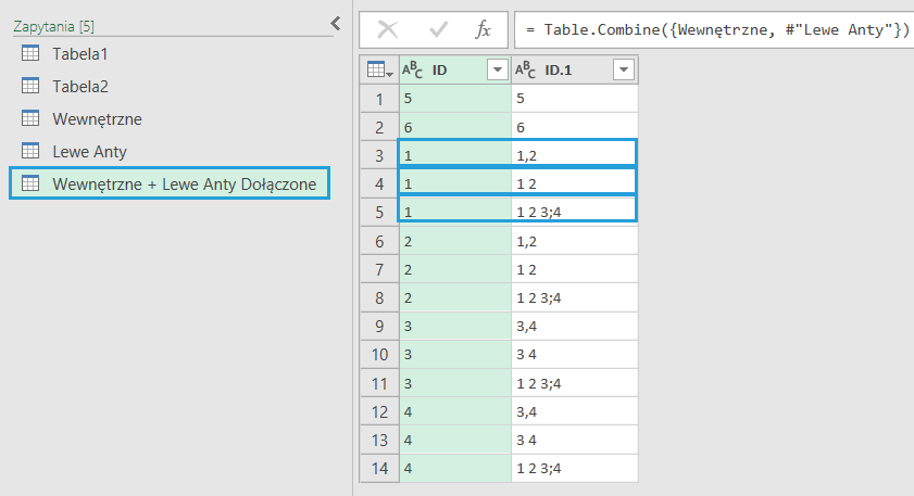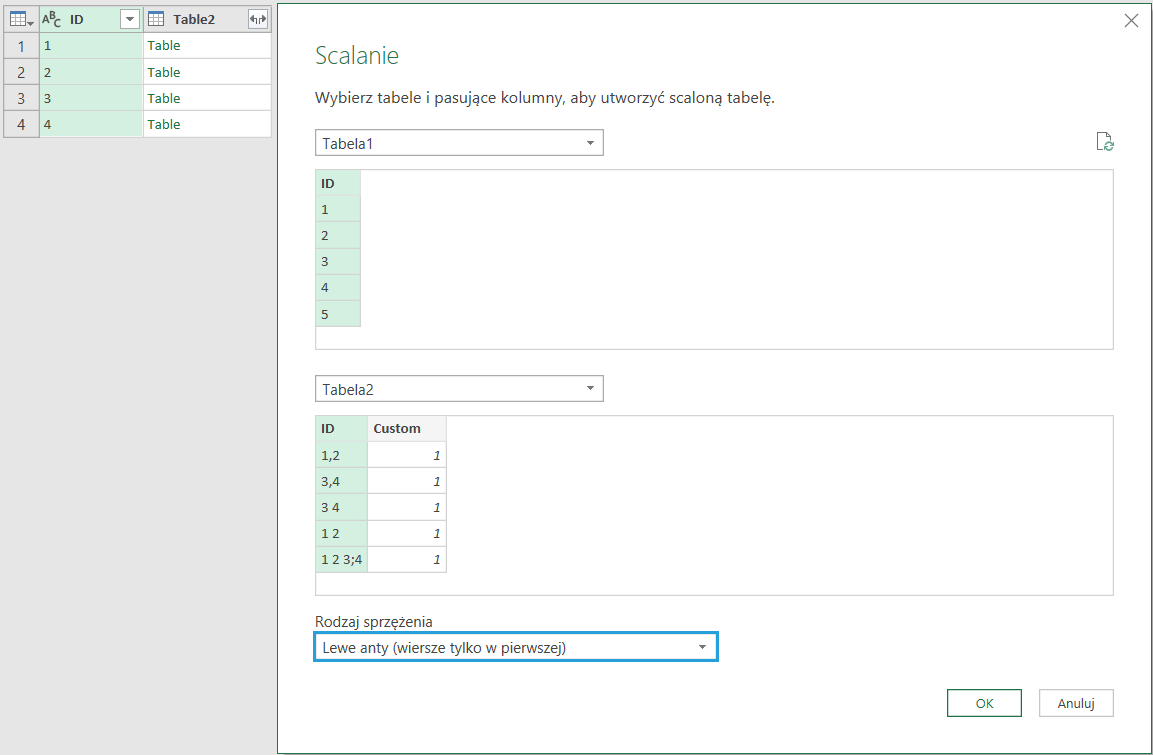 W ten sposób znajdziemy wszystkie kombinacje ID z Tabeli 1 z ID Tabeli 2 wg warunku „zawiera” (np. dla ID = 1).