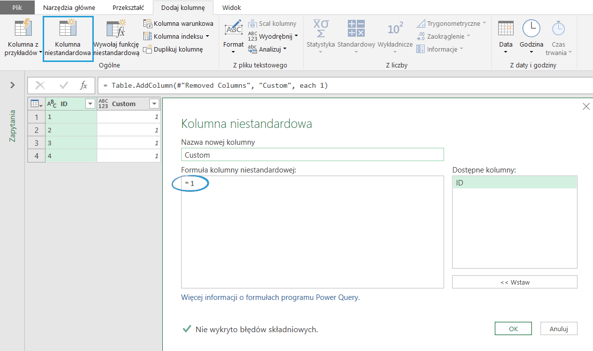 Krok 4: Dodaj kolumnę =1 do Tabeli 2 i Lewe Anty