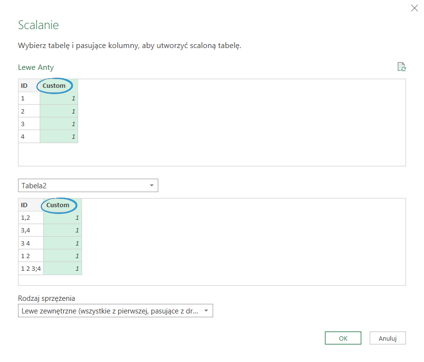 Uwaga: takie scalanie może dać bardzo wiele wierszy, np. 1000 w Lewe Anty x 1000 w Tabela 2 = 1 mln rekordów.