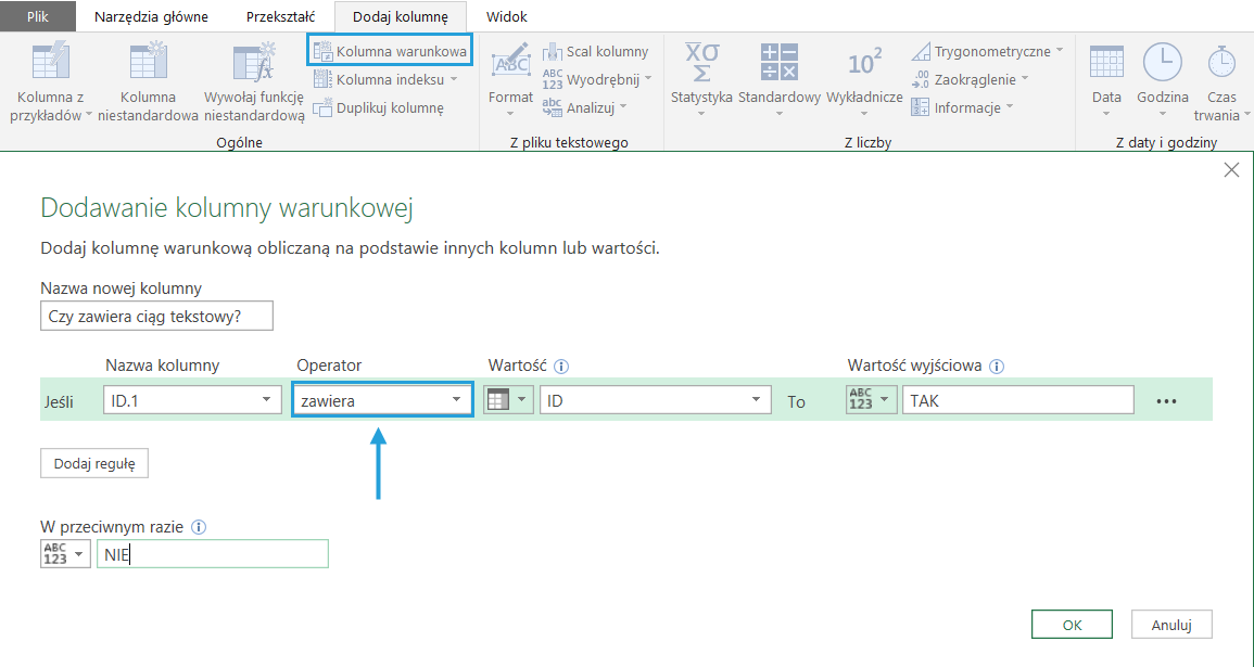 Kolumna warunkowa ma funkcję „zawiera”, interpretowaną przez język M jako Text.Contains.