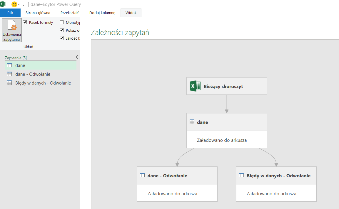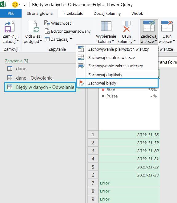 Odwołanie świetnie przydaje się do tworzenia dynamicznego połączenia z głównym zapytaniem i rozbicia ścieżki procesowej na dwie części: dane prawidłowe i błędy