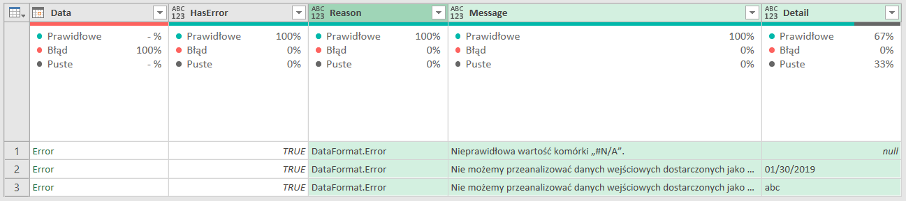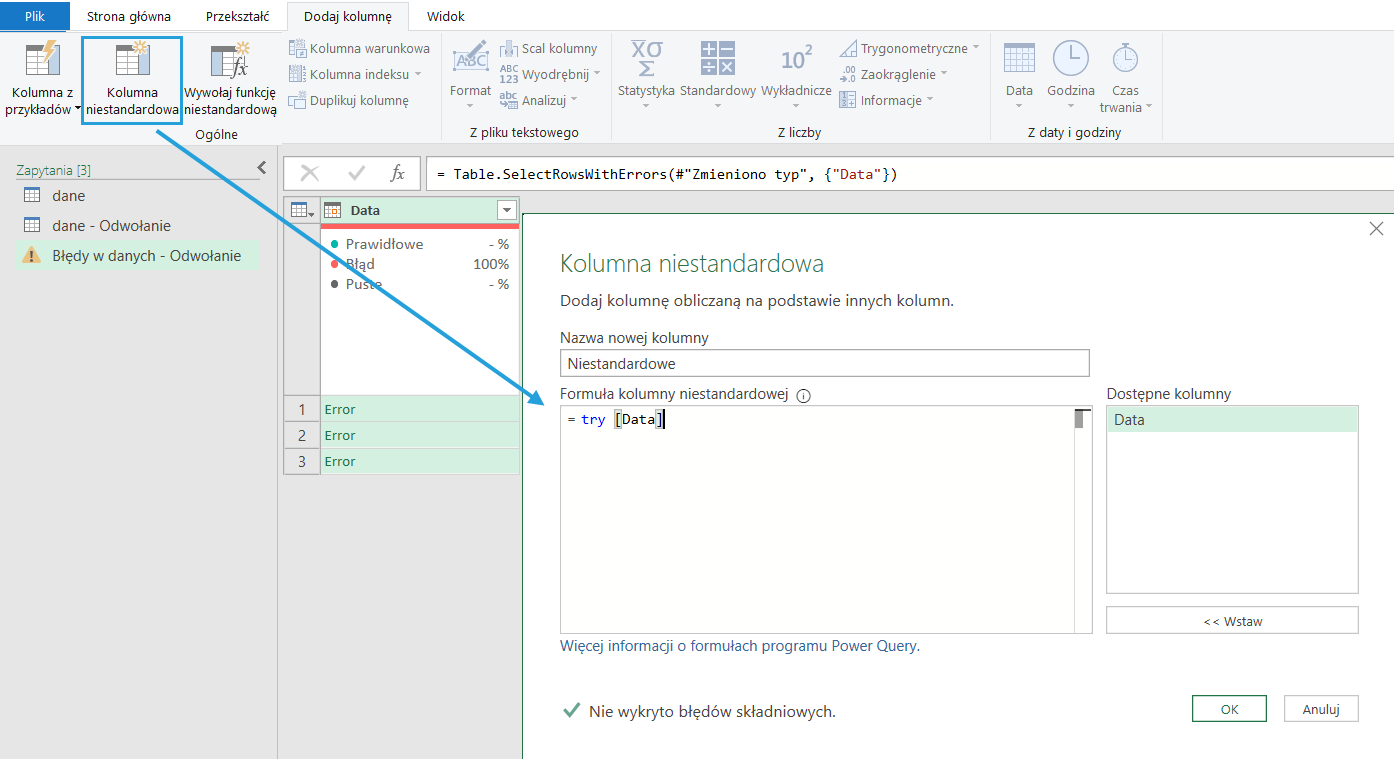 W zapytaniu z błędami dodamy kolumnę niestandardową i posłużymy się językiem M, aby dowiedzieć się więcej nt. błędów. Formuła ma postać: